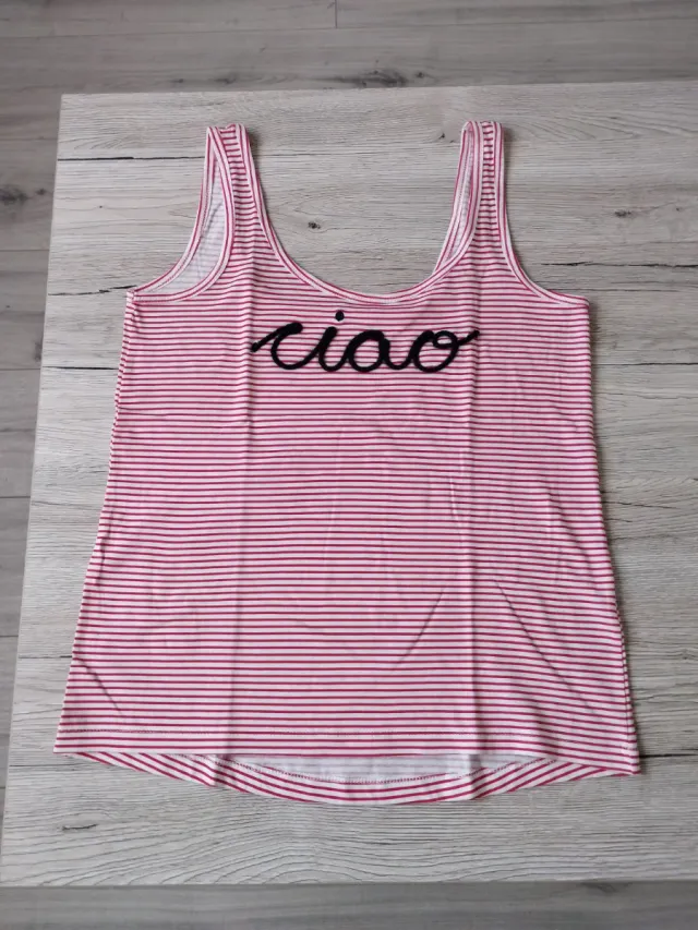 Camiseta de tirantes con estampado de rayas rojas y blancas. Luce un divertido ciao bordado en la parte delantera.
