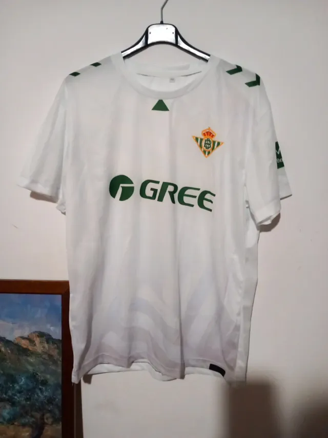 Camiseta deportiva de color blanco con detalles en verde. - Diseño con logo de equipo. - Cuello redondo. - Mangas cortas. Talla xxl