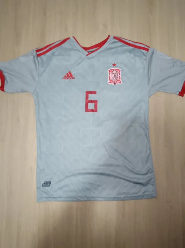 Camiseta de fútbol de la selección española. - Color gris con detalles en rojo. - Número 6 en grande en el frontal. - Logo de Adidas y escudo de la RFEF.