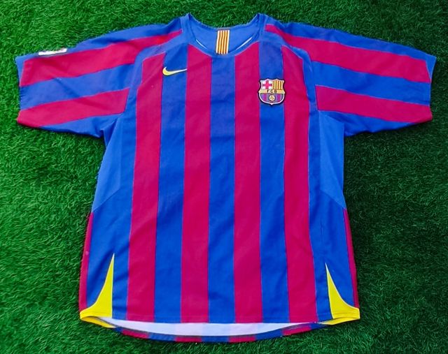 Detalles del productoCamiseta de fútbol del FC Barcelona de la temporada 2005/06. Diseño clásico con rayas verticales rojas y azules.