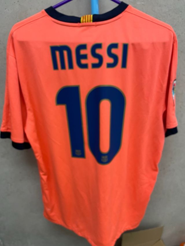 Camiseta del FC Barcelona de la temporada 2009-2010, con el dorsal y nombre de Leo Messi. - Color naranja. - Nombre Messi en azul. - Número 10 en azul.