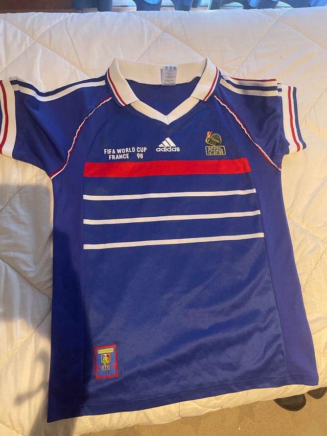 Detalles del productoCamiseta de fútbol de la selección de Francia, edición Copa Mundial 1998.