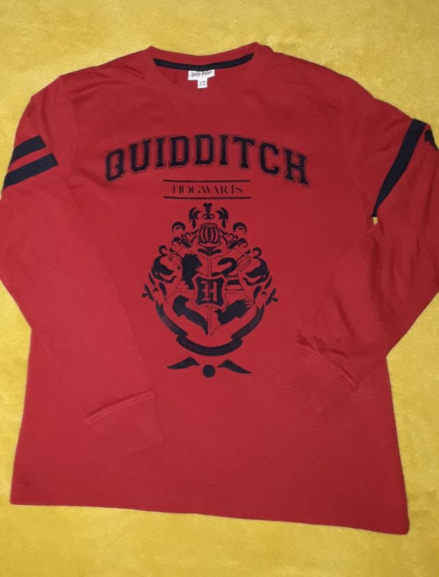 Detalles del productoCamiseta granate Quidditch de manga larga, escudo y letras en terciopelo marca OVS, en perfecto estado, como nueva.