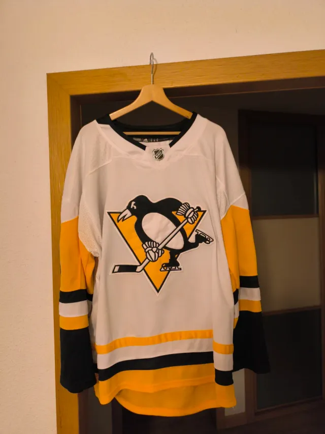 Camiseta de hockey de los Pittsburgh Penguins de la NHL. Talla 52. - Diseño oficial del equipo. - Colores blanco, negro y amarillo.