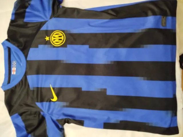Camiseta de fútbol del Inter de Milán con diseño a rayas azules y negras. - Logo del Inter de Milán bordado. - Swoosh de Nike. - Cuello redondo.