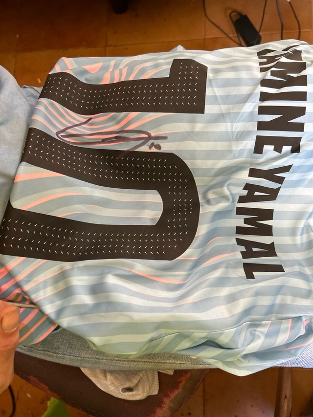 Detalles del productoCamiseta de Lamine Yamal de La Capital,talla L. Diseño con rayas azules y detalles rosas.
