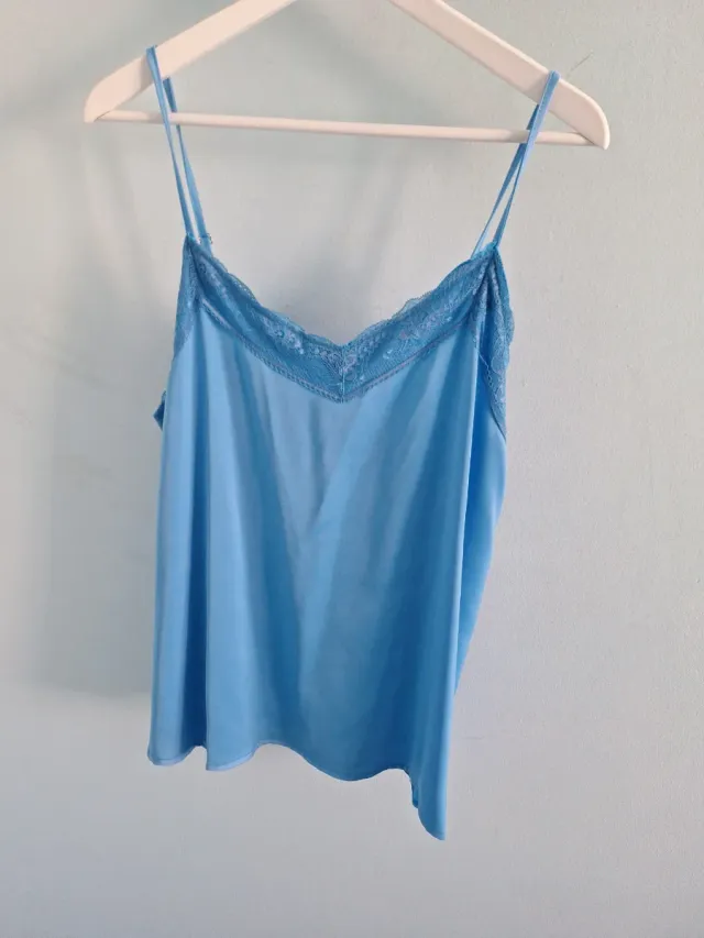 Camiseta de estilo lencero con tirantes finos y detalle de encaje en el escote.