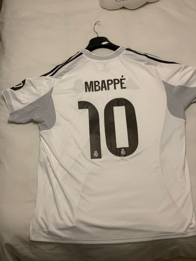 Camiseta de fútbol con el dorsal 10 y el nombre de Mbappé. - Color blanco con detalles grises y negro. - Logo del Real Madrid en la parte inferior del número.