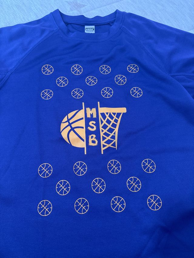Camiseta azul con estampado de baloncesto y el logo MSB. - Diseño con balones de baloncesto. - Logo central de MSB con una canasta.