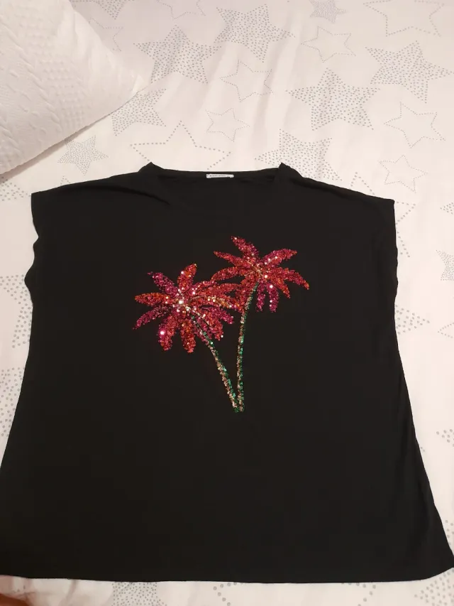 Camiseta Negra con Palmeras Lentejuelas Talla L