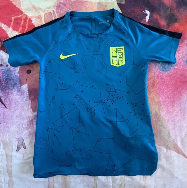 Camiseta de fútbol azul con diseño gráfico y el logo de Neymar. - Marca Nike. - Tecnología Dri-Fit. - Diseño con líneas y estrellas. - Escudo de Neymar en amarillo.