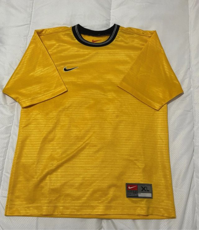 Camiseta de fútbol Nike de color amarillo. - Talla XL de niño - Logo de Nike en el pecho. - Cuello redondo con ribete negro y gris.