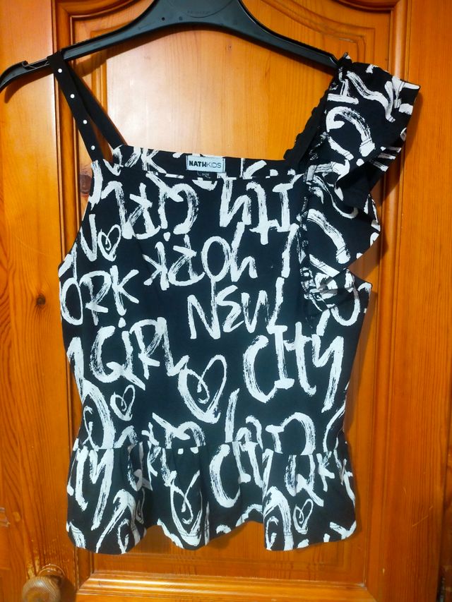 Detalles del productoPreciosa camiseta para niña de 14 años. Es de color negro con estampado blanco. Tiene un diseño original y moderno.