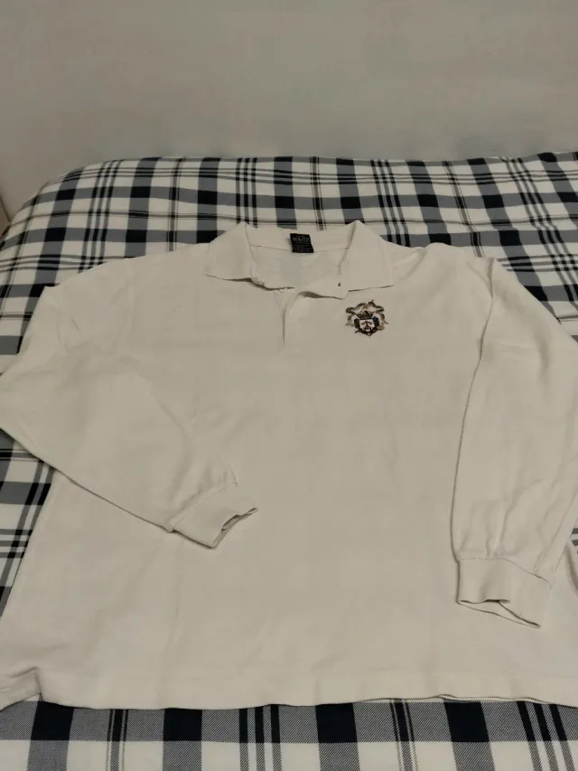 Camiseta polo de manga larga en color blanco. Presenta un escudo bordado en el pecho. Talla s y m manga larga - Cuello tipo polo. - Puños elásticos en las mangas.