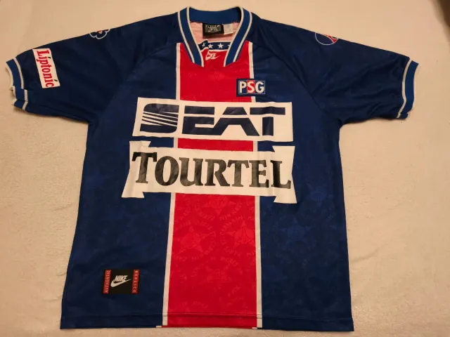 Detalles del productoCamiseta de fútbol del Paris Saint-Germain (PSG) de la temporada 1994/1995. Diseño clásico con los colores azul y rojo. Talla M