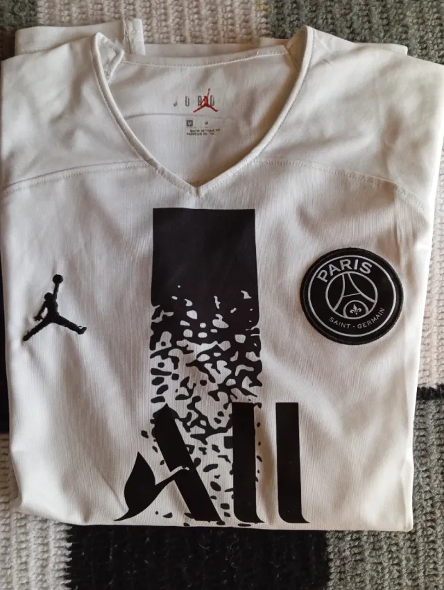 Camiseta del Paris Saint-Germain (PSG) de la marca Jordan. - Color blanco. - Diseño con logo de Jordan y escudo del PSG. - Talla M pero es como una L