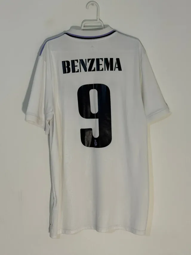 Camiseta del Real Madrid, rey de Europa de la temporada 2022/2023, con el dorsal de Karim Benzema. La camiseta está en muy buen estado, excepto por los puntos apenas imperceptibles que se ve en las fotos.