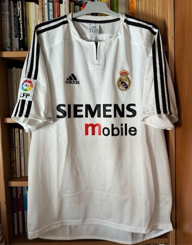 Detalles del productoTalla M. Totalmente original/oficial y en muy buen estado, con uso pero sin grandes desperfectos, tal y como se puede apreciar en las fotos. Camiseta blanca de local utilizada en la temporada 2003/2004, marca Adidas y con publicidad de Siemens Mobile. Toda una joya para coleccionistas y aficionados del Real Madrid Club de Fútbol.