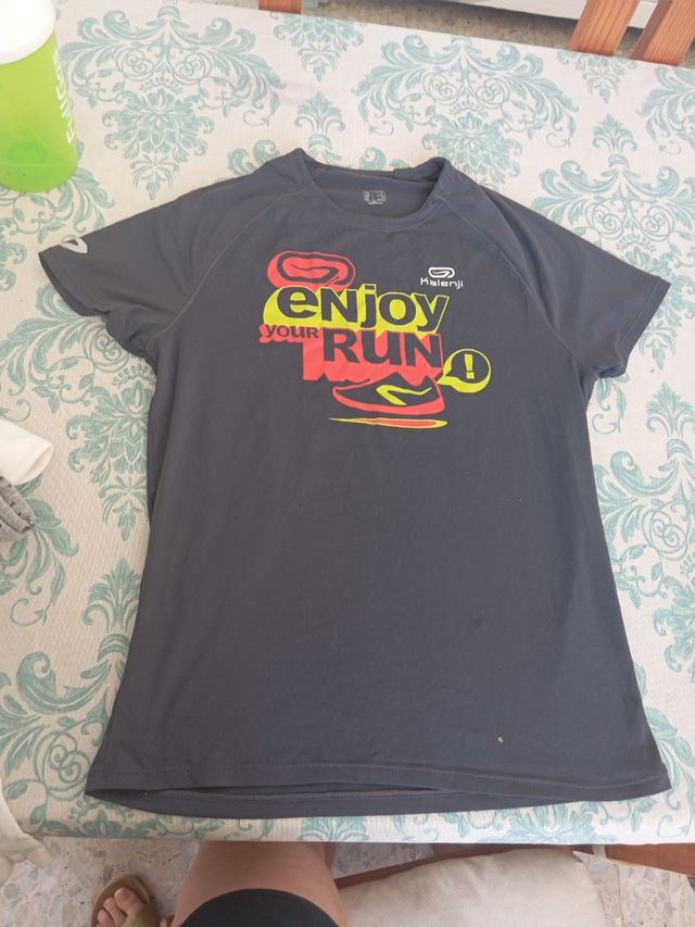 Camiseta de manga corta para running con un diseño llamativo. - Color gris oscuro. Talla 14 anos