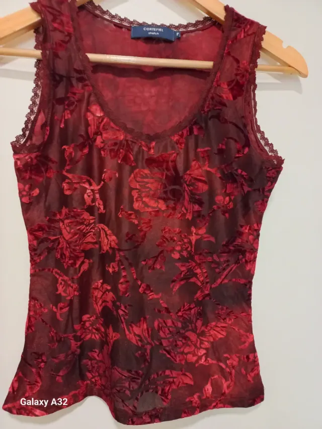 Camiseta de tirantes semitransparente en color granate, con un bonito estampado floral de terciopelo. SIN ESTRENAR. Cortefiel. Talla P.