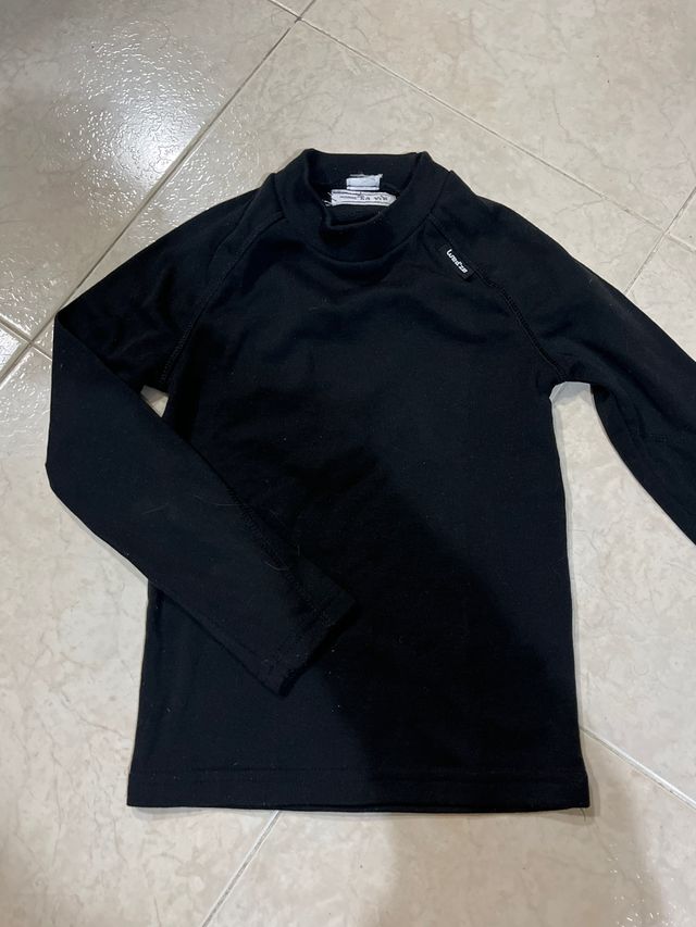 Camiseta térmica de manga larga para niño, de color negro. - Cuello redondo alto. - Tejido suave y elástico. - Marca: Quechua