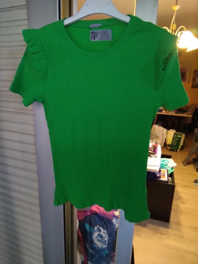 Camiseta de manga corta en color verde con un diseño moderno y detalles de volantes en los hombros, está nueva