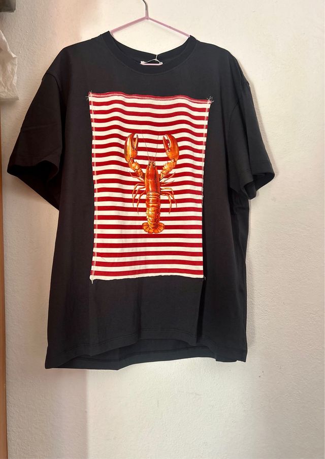 Camiseta de manga corta en color azul marino con estampado de langosta sobre fondo de rayas rojas y blancas en la parte delantera.