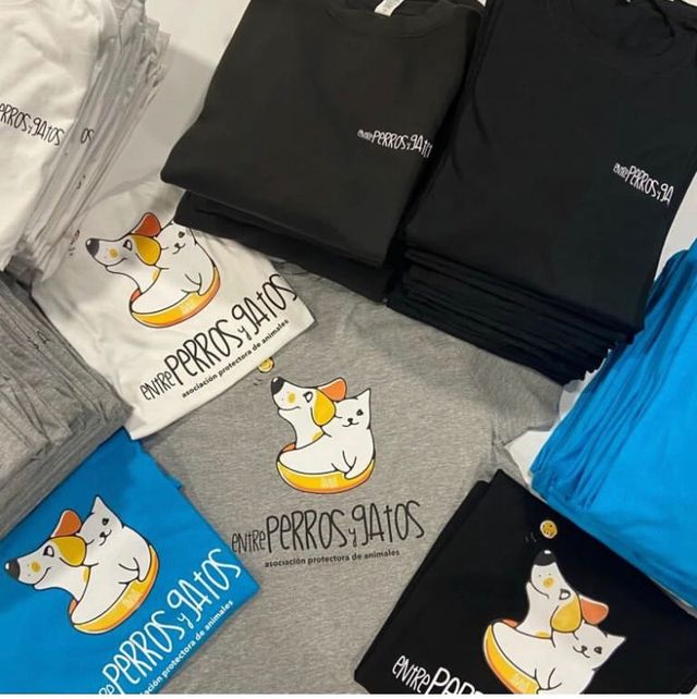 Camisetas solidarias a favor de la protectora Entre perros y gatos. Colores: Azul, blanco, negro y gris. Tallas: S, M, L, XL y XXL