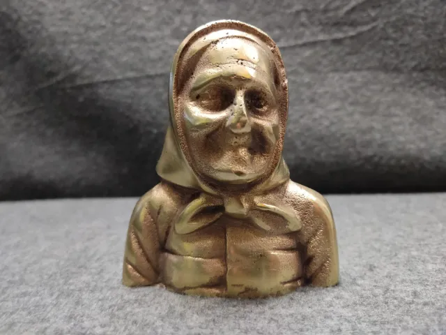 Detalles del productoCampana de bronce hecha a partir de una figura de bronce con motivo de busto de campesina. En la parte superior se nota el agujero de haber hecho la campana