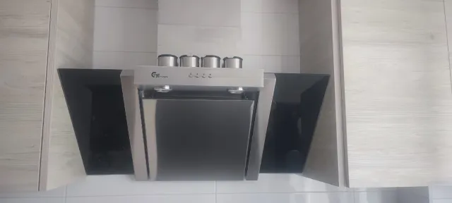 Detalles del productoCampana extractora de cocina con 90cm de ancho. Diseño moderno con acabados en acero inoxidable y cristal negro.
