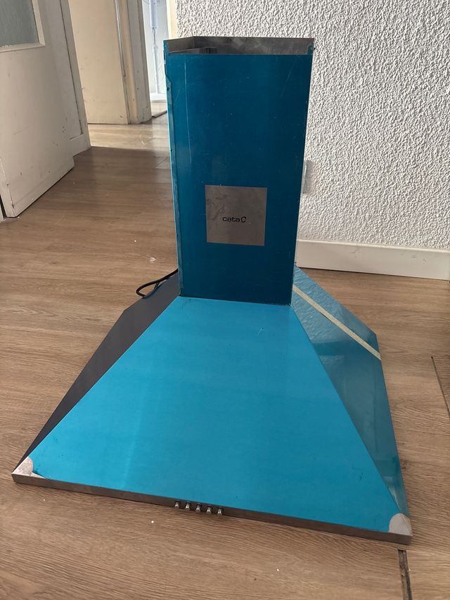 Campana extractora de cocina con un diseño moderno y elegante. - Acabado en acero inoxidable y azul. - Placa con logo 'Cata'.