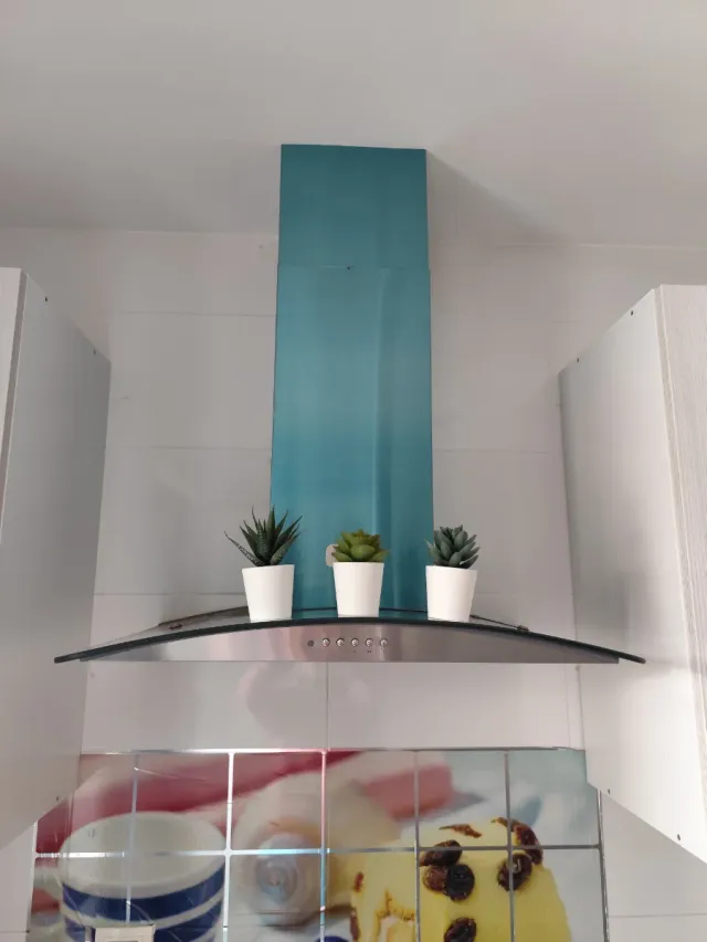Campana extractora de diseño moderno con acabado en color azul y detalles en cristal. Luz en azul - Estructura de cristal y acero inoxidable.