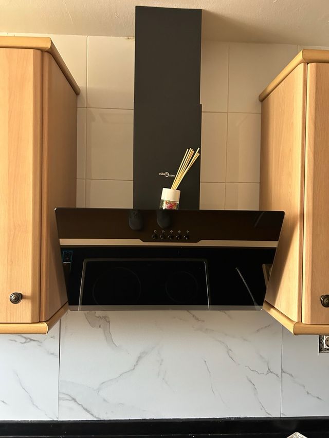 Campana extractora de diseño moderno para cocina. - Acabado en cristal negro y acero inoxidable. - Iluminación LED integrada. - Panel de control táctil.