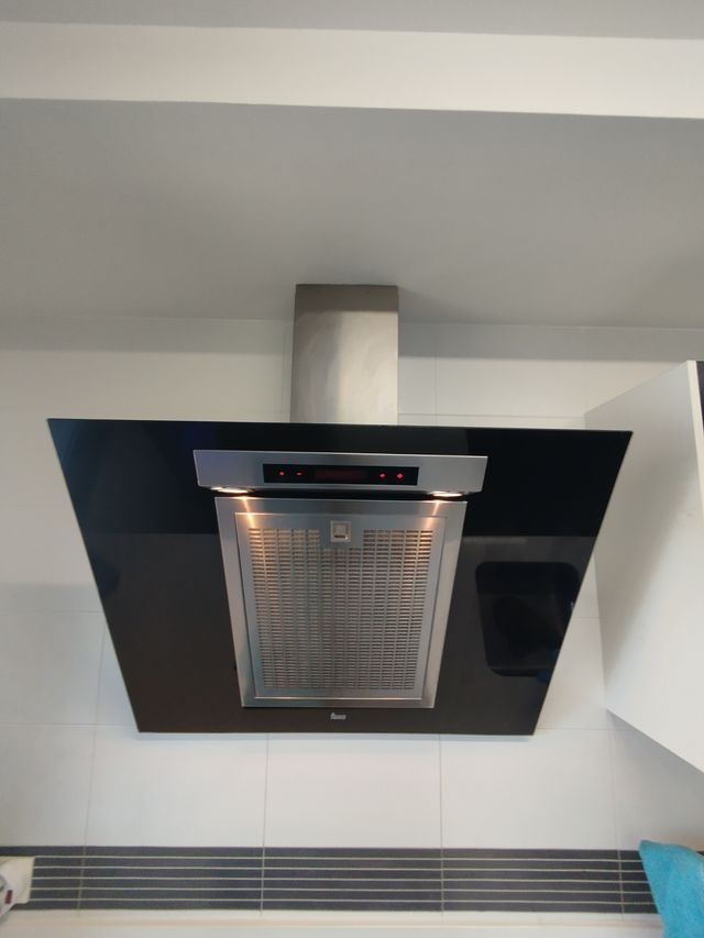 Campana extractora de la marca Teka. Diseño moderno con acabados en cristal negro y acero inoxidable. - Cristal negro. - Acero inoxidable. - Filtros metálicos.