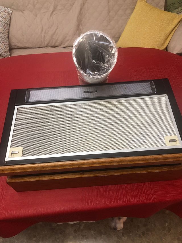 con tubo flexible para salida de humos ,muy potente y con 2 luces que son de led y alumbran muy bien