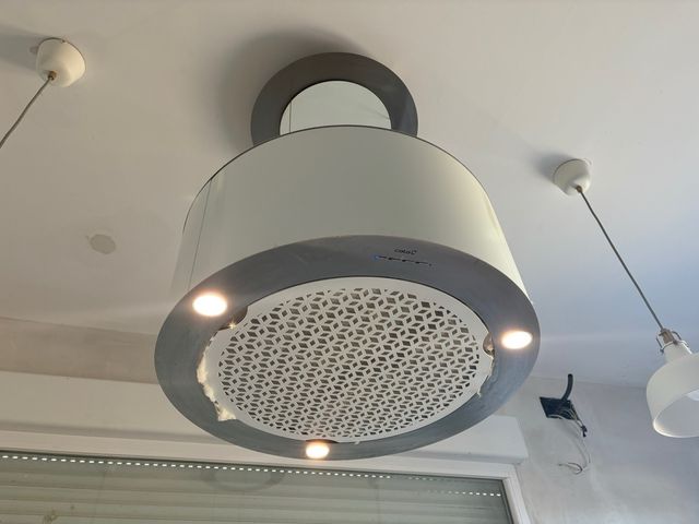 Detalles del productoCampana extractora de diseño moderno para isla de cocina.