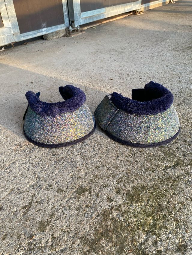 Detalles del productoPar de campanas para caballo con un diseño de purpurina y forro de borreguito. Marca horsegear y talla Full pero son pequeñas, más bien cob. Casi nuevas.