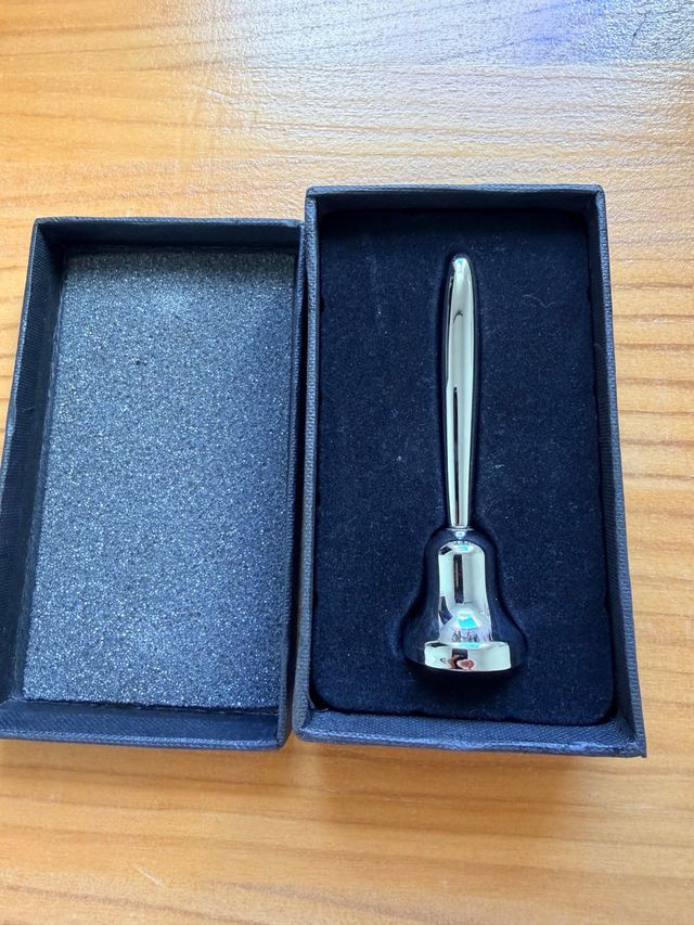 Detalles del productoPequeña campanita decorativa con acabado plateado, ideal para añadir un toque elegante a cualquier espacio.