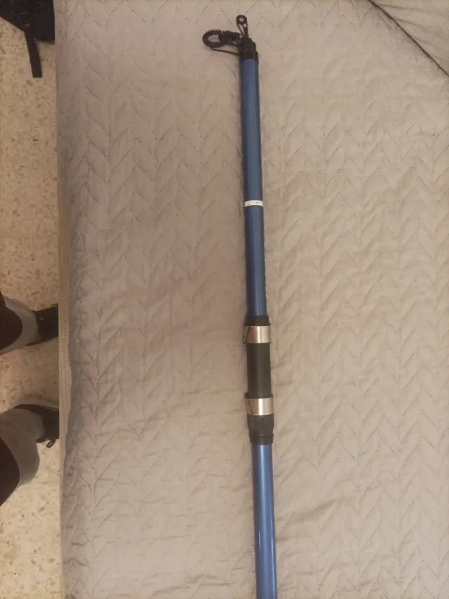 Caña de pesca de color azul con detalles en negro y plateado. - Mango negro. - Anillas plateadas.