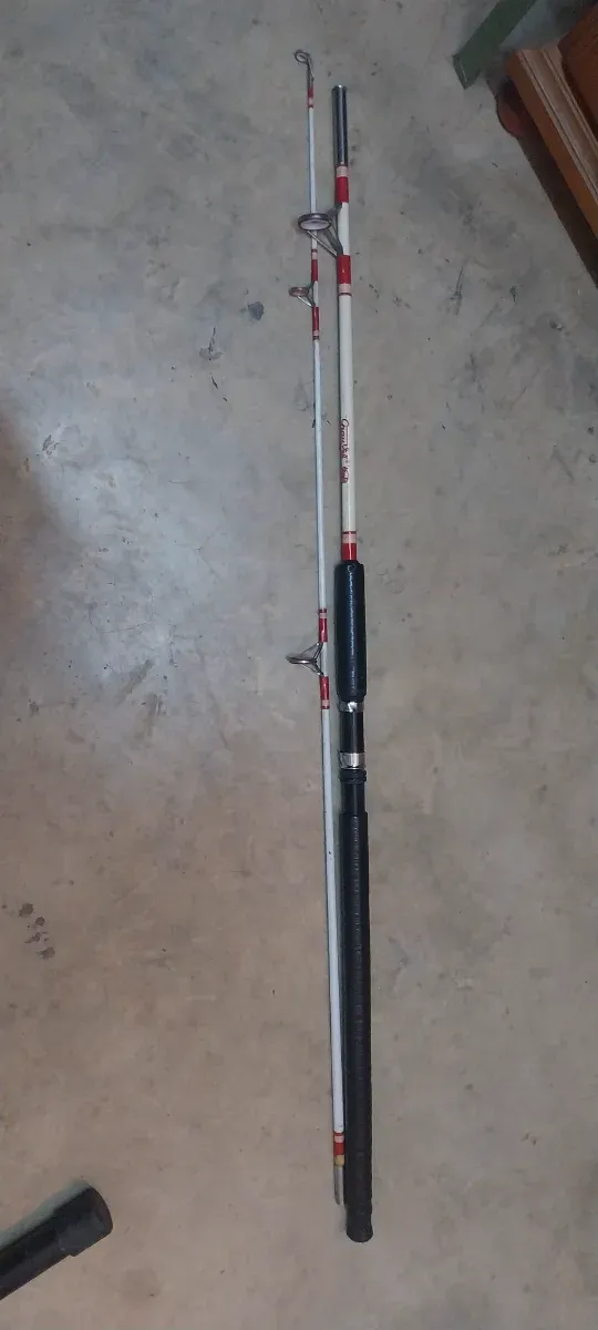 Caña de pesca de dos piezas con mango negro. - Color blanco con detalles rojos. - Mango de material negro. - Anillas metálicas.