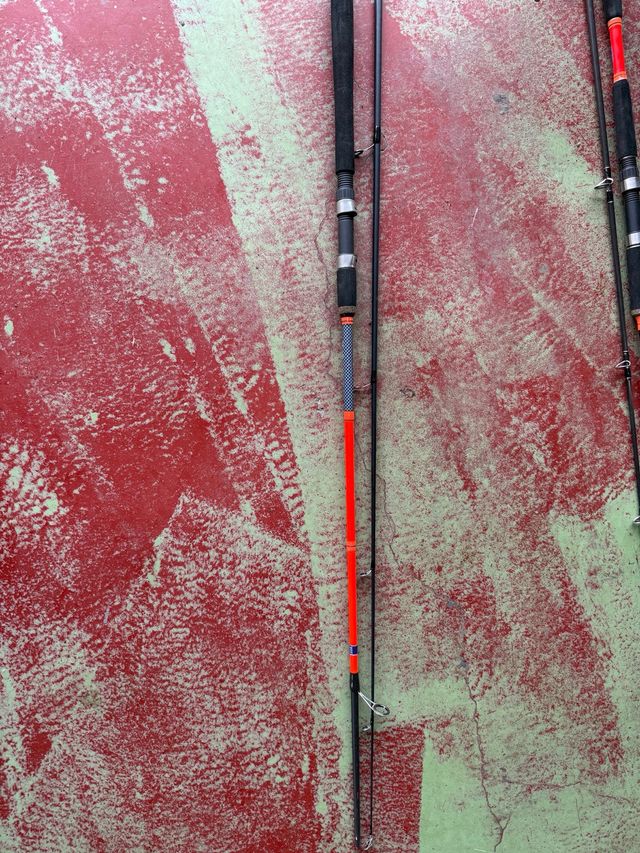 Detalles del productoCaña de pesca deportiva con mango de goma y detalles en naranja y gris.