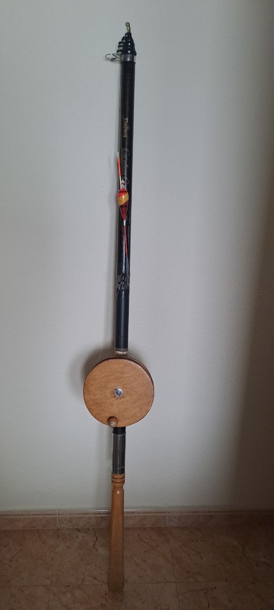 Caña de pescar con carrete de madera y caña con un 80% de carbono. Mide 8 m. extendida