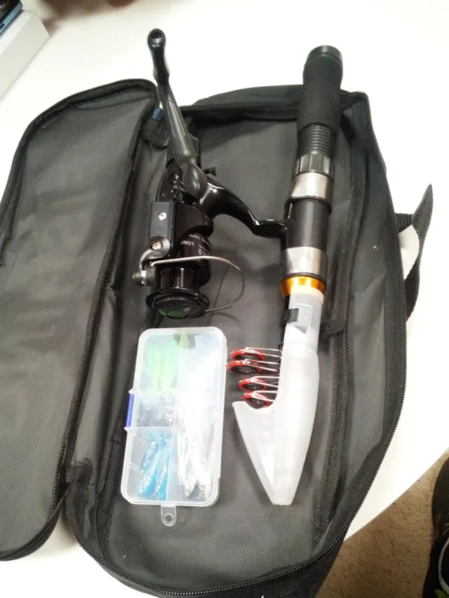 Set de pesca completo con caña y anzuelos. - Caña de pescar de 2.30 metros. - Incluye caja con varios anzuelos y señuelos de pesca.