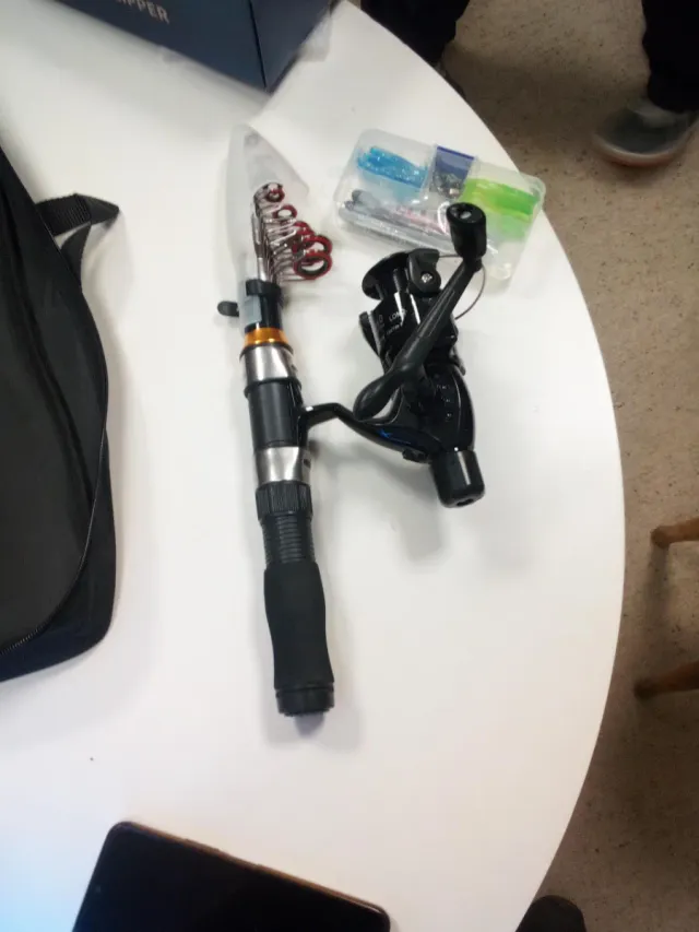 Se vende caña de pescar de 2.30 metros de longitud, junto con un set de anzuelos. - Caña de pescar telescópica. - Incluye caja con varios anzuelos.