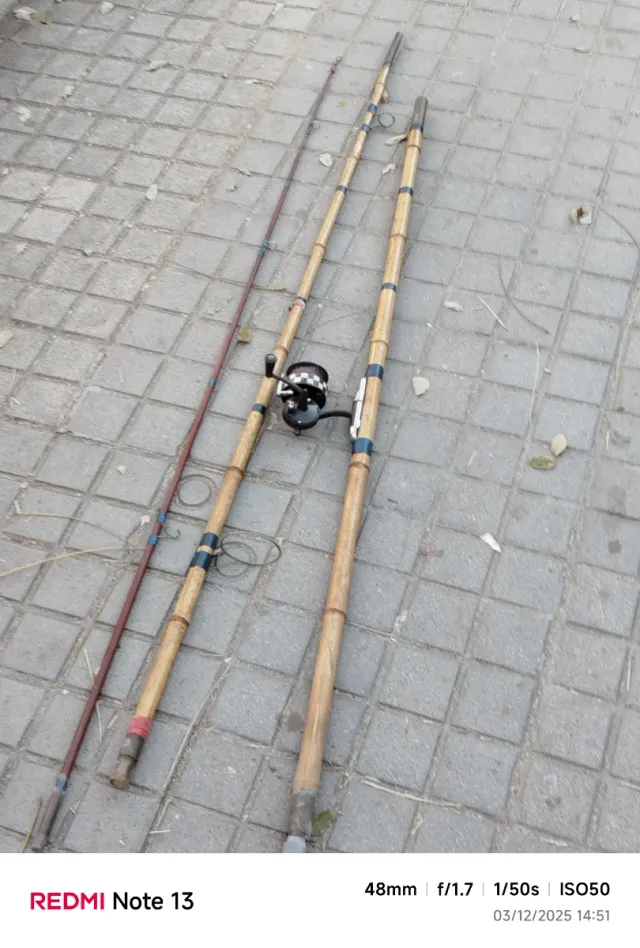 Detalles del productoCaña de pescar antigua fabricada en bambú. Mide 5 metros de largo.