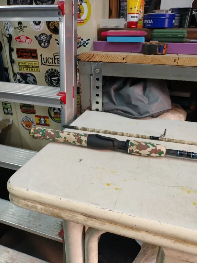 Detalles del productoCaña de pescar con un diseño de camuflaje.Carbono y acción 5/20