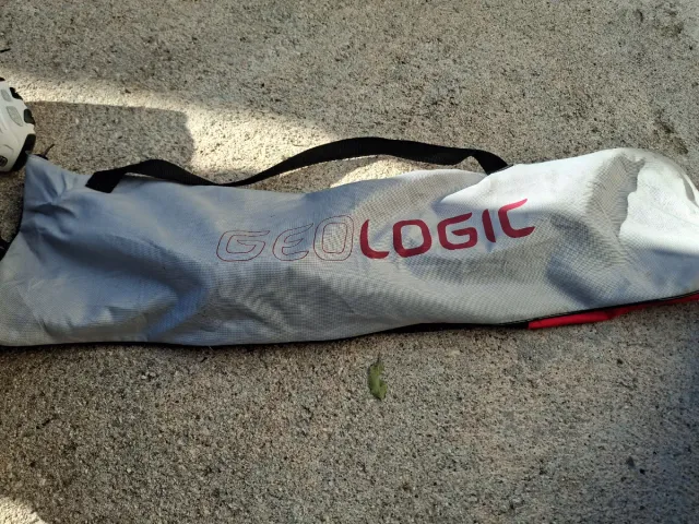 Funda para caña de pescar Geologic. Es ligera y fácil de transportar. - Color gris con logo rojo. - Asa de transporte negra.