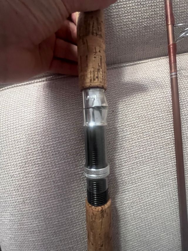 Caña de pescar con mango de corcho y portacarrete. - Mango de corcho. - Portacarrete metálico.