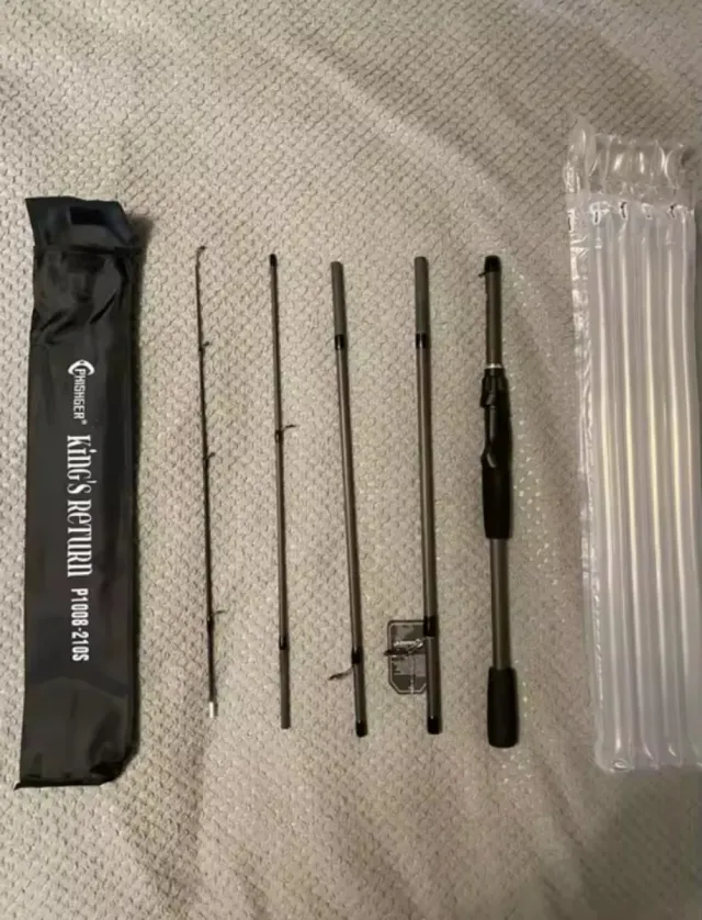 Detalles del productoCaña de pescar de la marca PISHGEER, modelo King's Return P1008-210S. Se compone de varias secciones para facilitar su transporte.