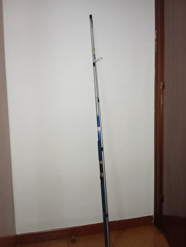 Caña de pescar telescópica de color plateado y azul. - Mango de goma. - Anillas de metal. - Diseño de varias secciones.